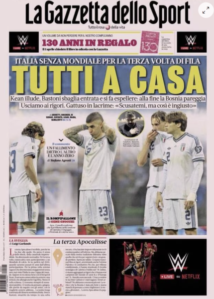 La presse italienne évoque une « troisième apocalypse » pour qualifier ce nouveau fiasco. Manquer une Coupe du monde pour la troisième fois consécutive est un choc pour un pays où le football est une passion viscérale. La Gazzetta dello Sport souligne : « Pour la première fois, des enfants grandiront sans avoir vu l’Italie en Coupe du monde. »
