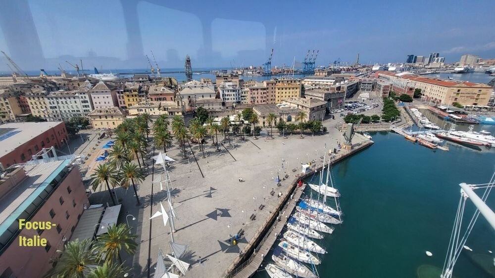 Le port de Gênes s'étend sur environ 22 kilomètres, faisant de lui l'un des plus grands ports d'Italie. Il dispose d'infrastructures pour le commerce, la pêche et le transport de passagers. Les grands paquebots de croisière sont éloignés, tout comme les cargos, les grues de chargement, et les centaines de conteneurs qui s'accumulent sur les quais en attente d'être expédiés à travers l'Europe.